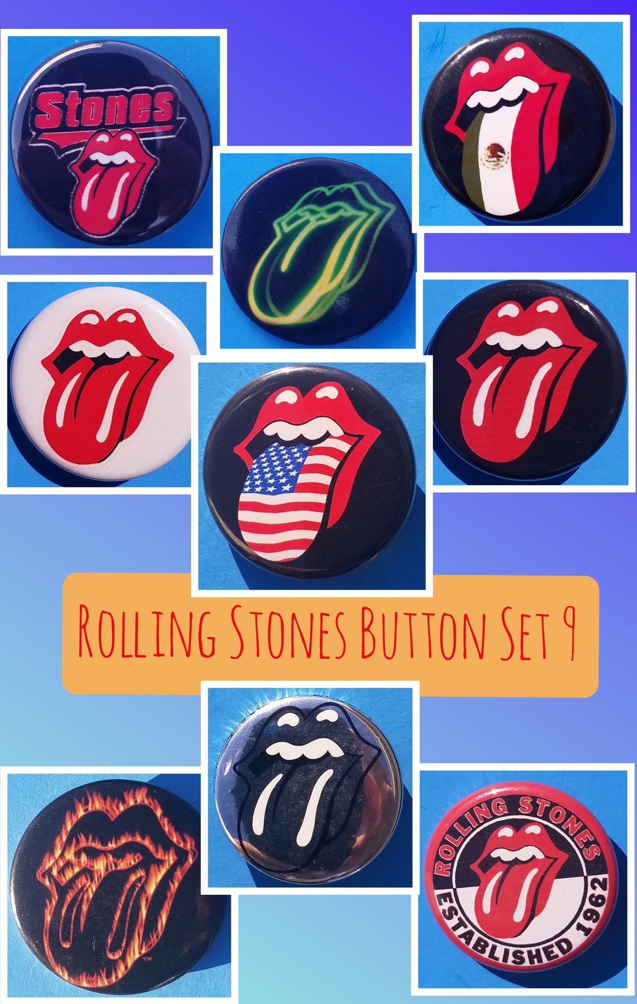 1. Rolling Stones USA Flag 2. Rolling Stones Silver Tongue 3. Rolling Stones Regular Tongue On White 4. Rolling Stones Red On Black Tongue 5. Rolling Stones Neon Tongue 6. Rolling Stones Mexican Flag Tongue 7. Rolling Stones Flame Tongue 8. Rolling Stones Est. 1962 9. Rolling Stones (Stones) Tongue On Black. Made In The U.S.A.
