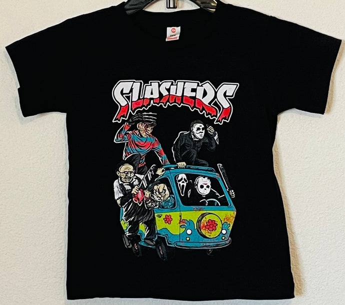 New "Slashers Mystery Machine" Youth Horror Silkscreen T-Shirt. Available In XS-XL Youth.