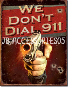 New "We Don't Dial 911" Home Protection Warning Metal Sign. 12.5"W x 16"H. This is a Reproduction Of A Classic Vintage Sign. It Has Pre-Punched Holes For Easy Hanging. Manufactured With Folded Edges For Safety, Durability and Stability. Sign May Have Intentional Distressing As Part Of The Look. Made In The U.S.A.